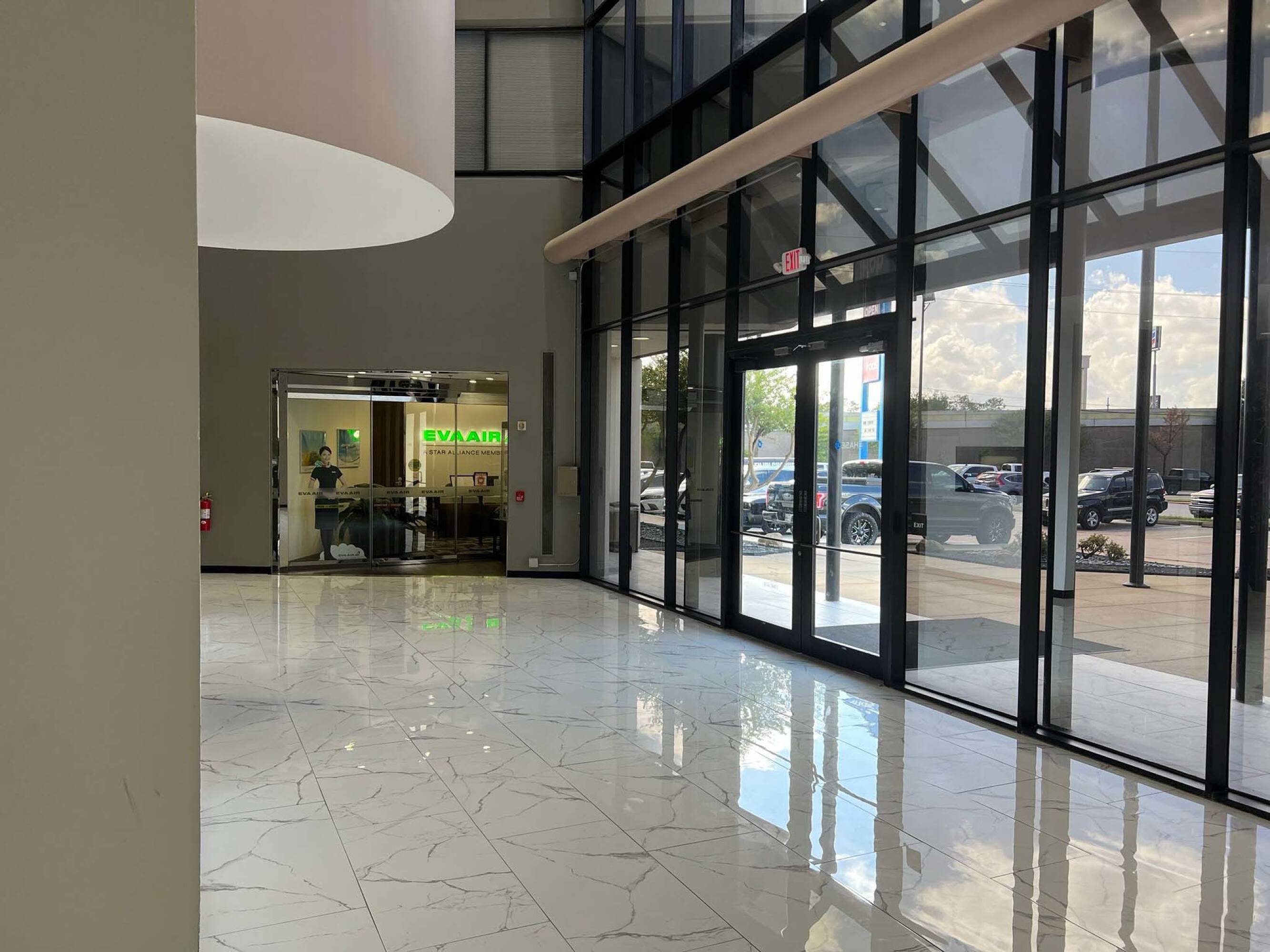 - Layout: Open lobby area with polished marble flooring, leading to elevator access and glass-walled conference room.