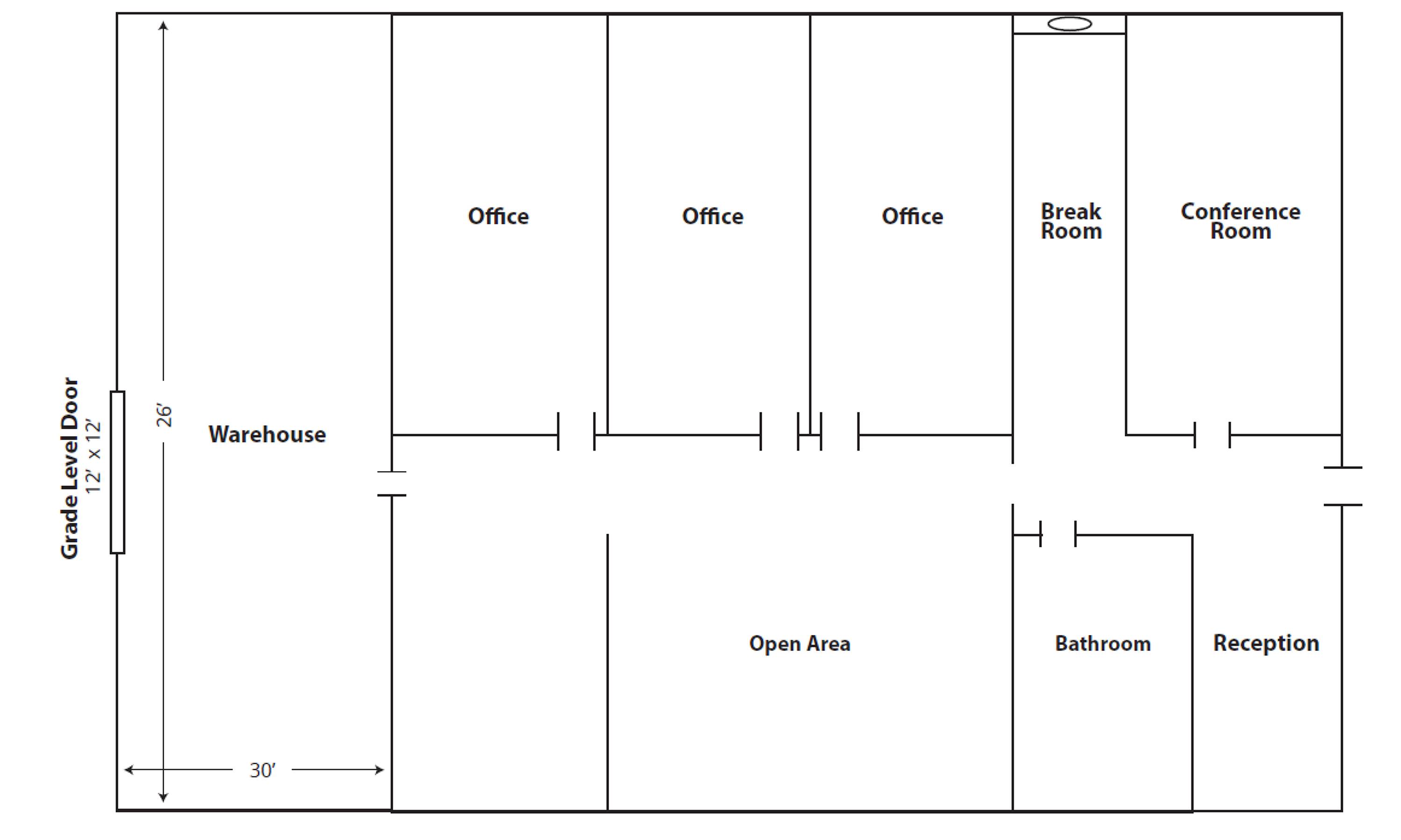 - Layout: Open warehouse space with adjacent office and break room areas